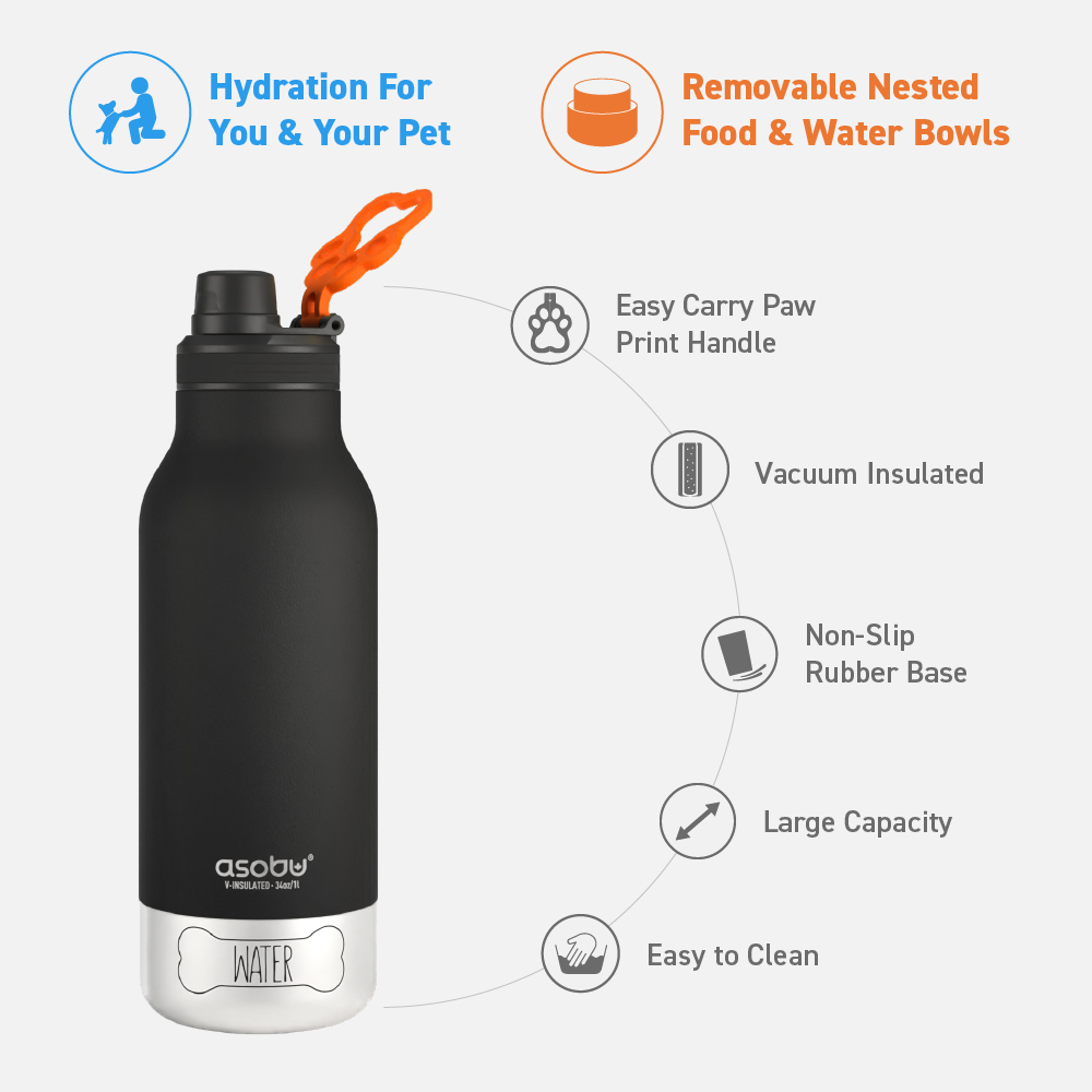 Le Barky d’ASOBU est équipé d’un bol à eau amovible situé au fond du biberon. Il suffit de verser le contenu de la bouteille dans la gamelle de votre chien pour l’hydrater tout au long de la journée, tandis que vous pouvez boire le contenu de la bouteille sans risque de contamination croisée. Une fois que vous avez retiré ce bol, vous disposez d’un autre bol à l’intérieur pour ranger et donner à votre chien de la nourriture ou des snacks. La bouteille est munie d’une poignée facile à transporter et a une capacité de 34 oz. Ainsi, vous et votre meilleur ami aurez plus qu’assez d’eau à partager. Partager, c’est prendre soin !