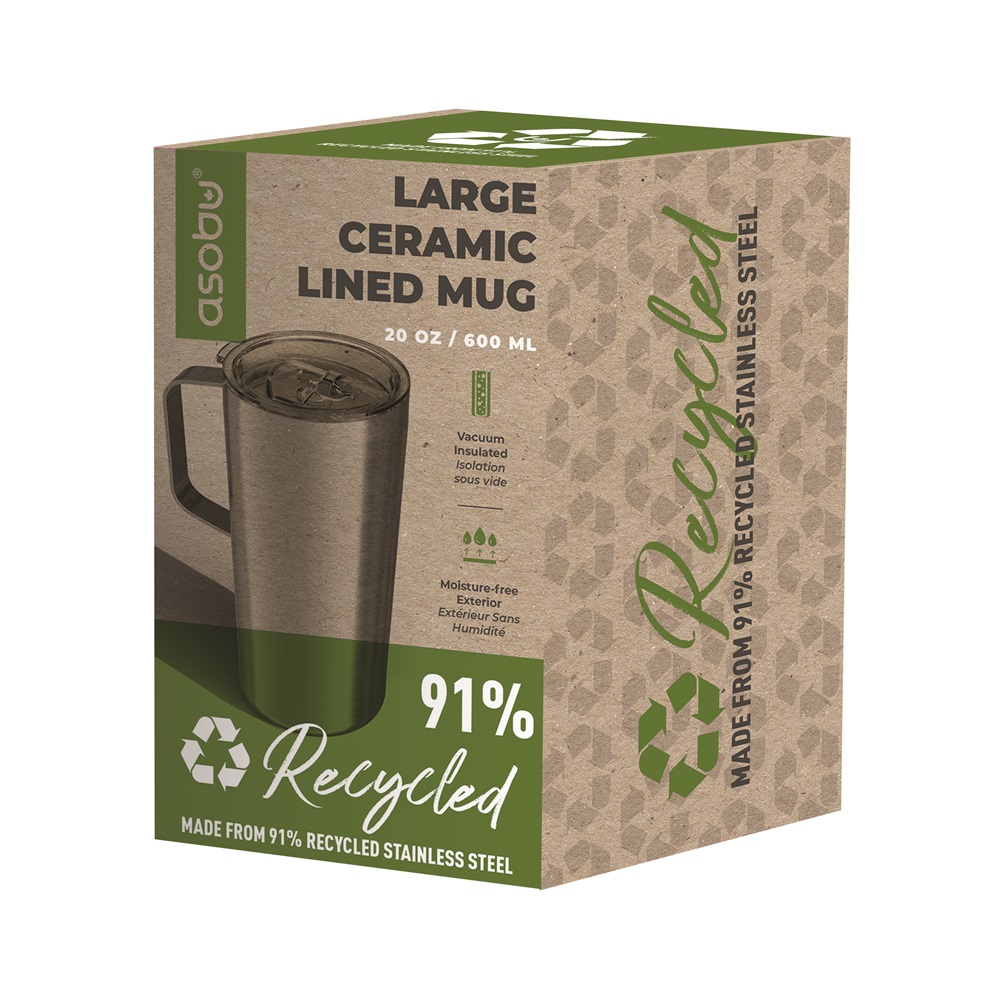 ASOBU is proud to be at the forefront of eco-friendly drinkware with products made of 91% recycled stainless steel such as the ECO SM90. The sturdy Tower Mug stands tall above the rest, featuring an ergonomic handle and a convenient transparent lid for easy access. Its vacuum-insulated stainless steel body and ceramic-coated interior keep beverages hot for hours while ensuring no metallic taste—just pure, fresh flavor with every sip.